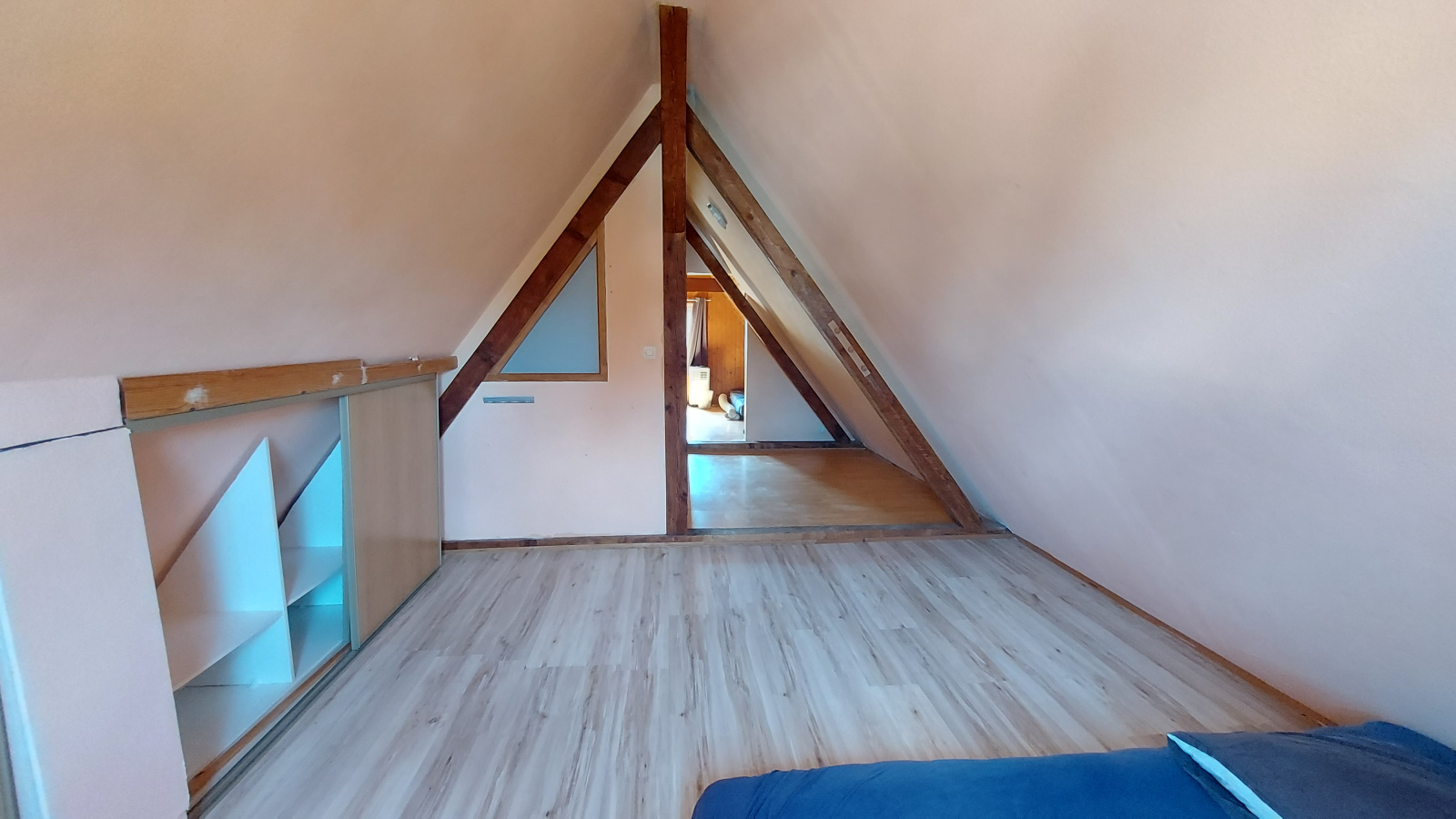 Au 2ème étage, un espace bureau, une salle de bains avec wc et une chambre.