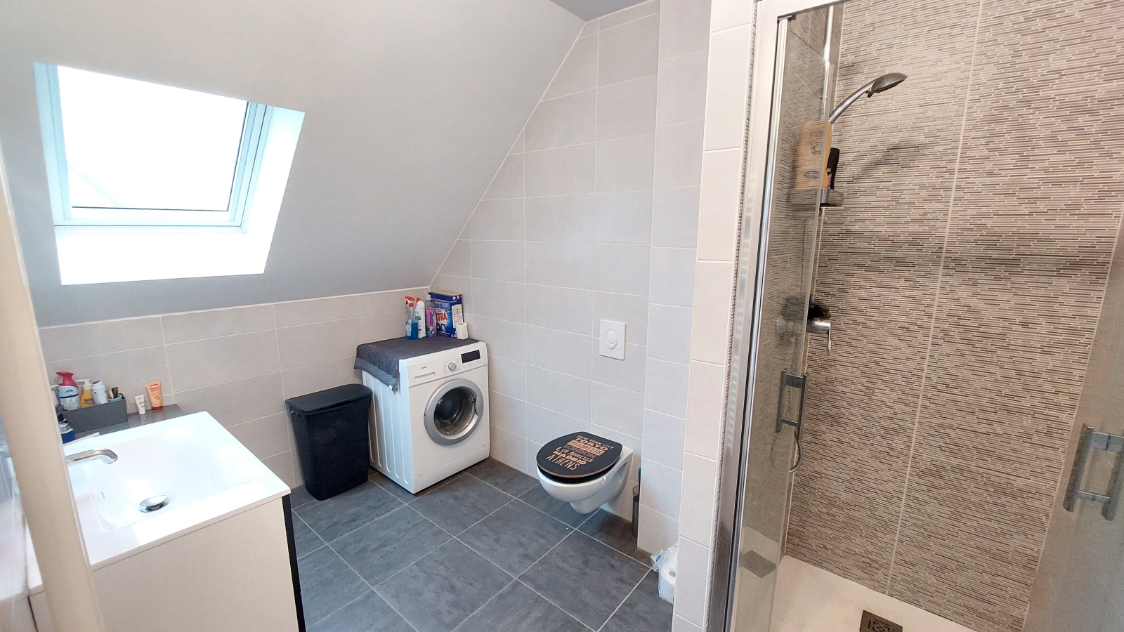 À l’étage, la chambre cocooning et la salle d’eau contemporaine offrent un véritable espace nuit, intime et agréable.