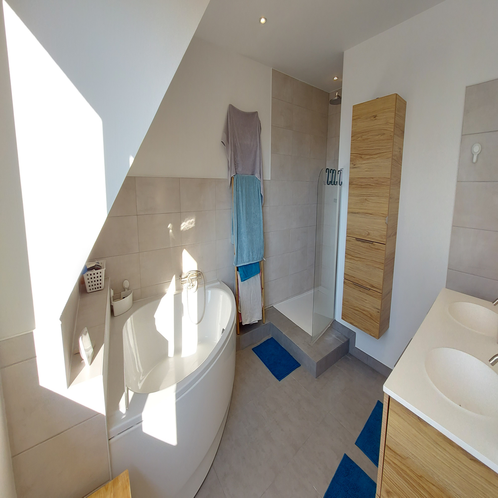 Au 1er étage, un dégagement offrant un bel espace pour bureau avec rangements, 3 belles chambres, un wc, une salle de bains avec baignoire et douche.