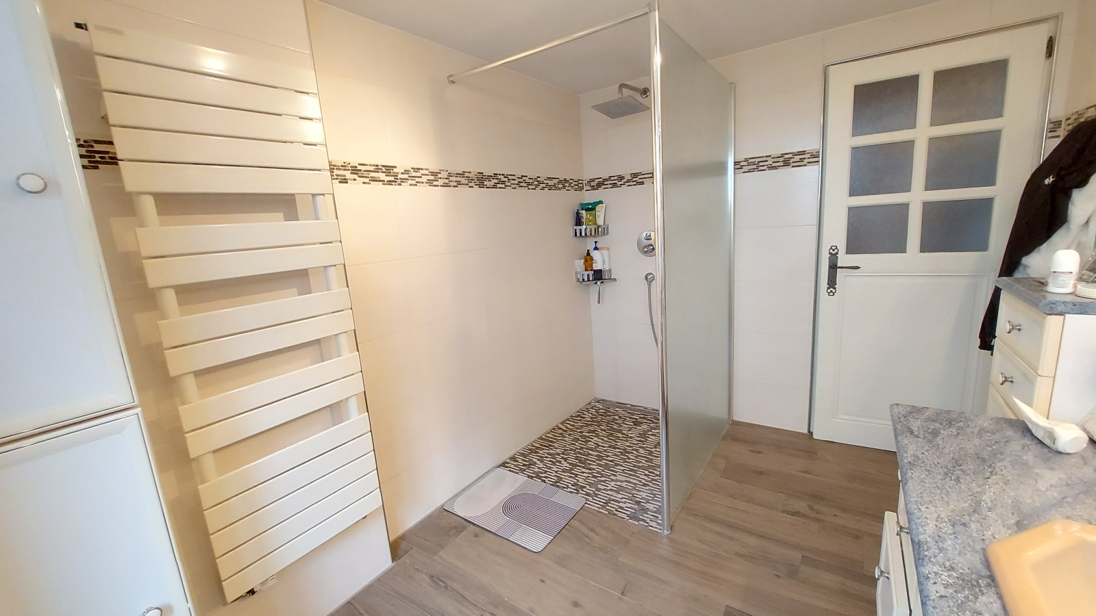 Elle se compose au rez-de-chaussée: d'une entrée avec placards, un dégagement avec espace bar, un séjour avec poêle à bois, une jolie cuisine équipée avec coin repas, un dégagement donnant vers une salle d'eau avec douche à l'italienne, un wc séparé, une pièce buanderie pouvant aussi devenir une cuisine d'été donnant vers la terrasse et le garage.