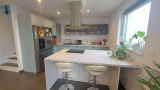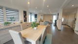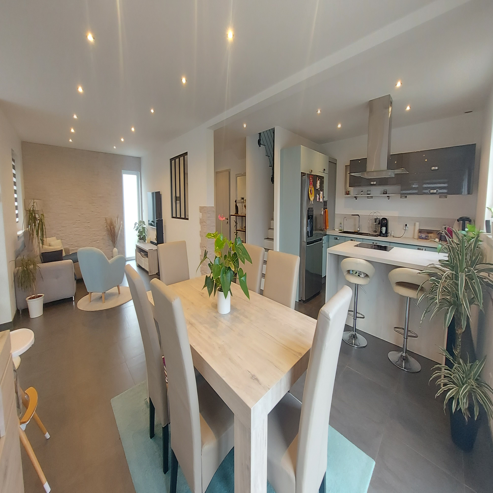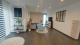 Belle maison d'architecte 5P de 120 m² (130 m² au sol) de 2018, qui comprend au rdc une entrée avec rangements, un wc avec lave-mains, un cellier, une cuisine ouverte sur un grand salon/séjour lumineux qui donne accès à la terrasse et au jardin.