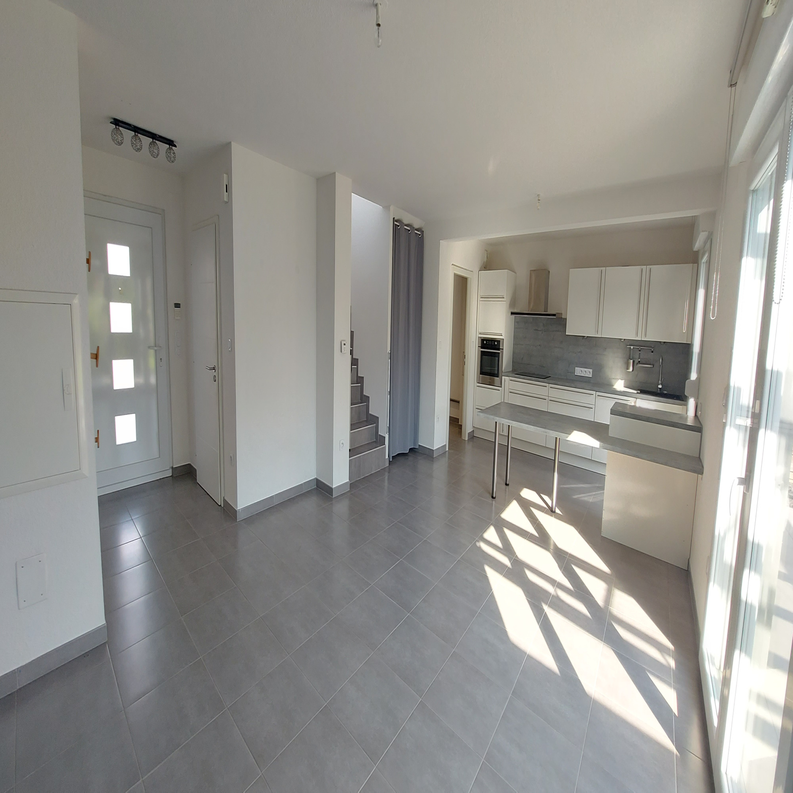 Sans travaux à prévoir, elle offre au rez-de-chaussée une entrée avec rangements, un WC, une cuisine ouverte sur un spacieux salon/séjour, un cellier, ainsi qu'un accès direct à une terrasse couverte et au jardin.