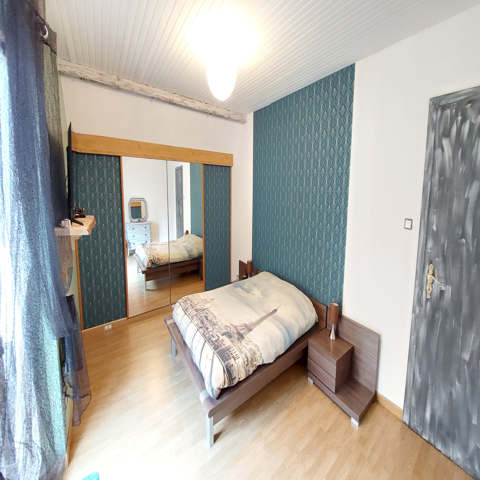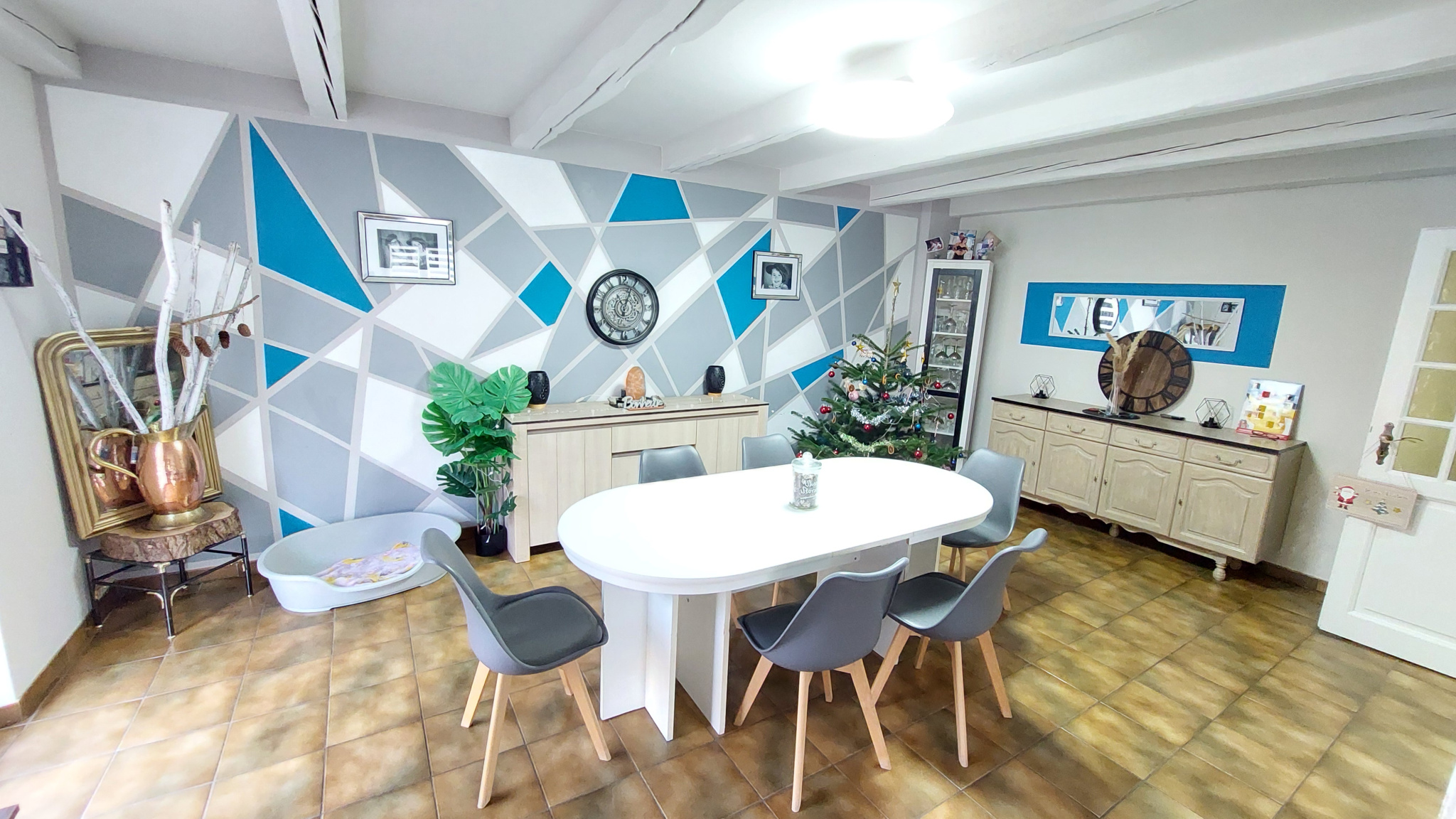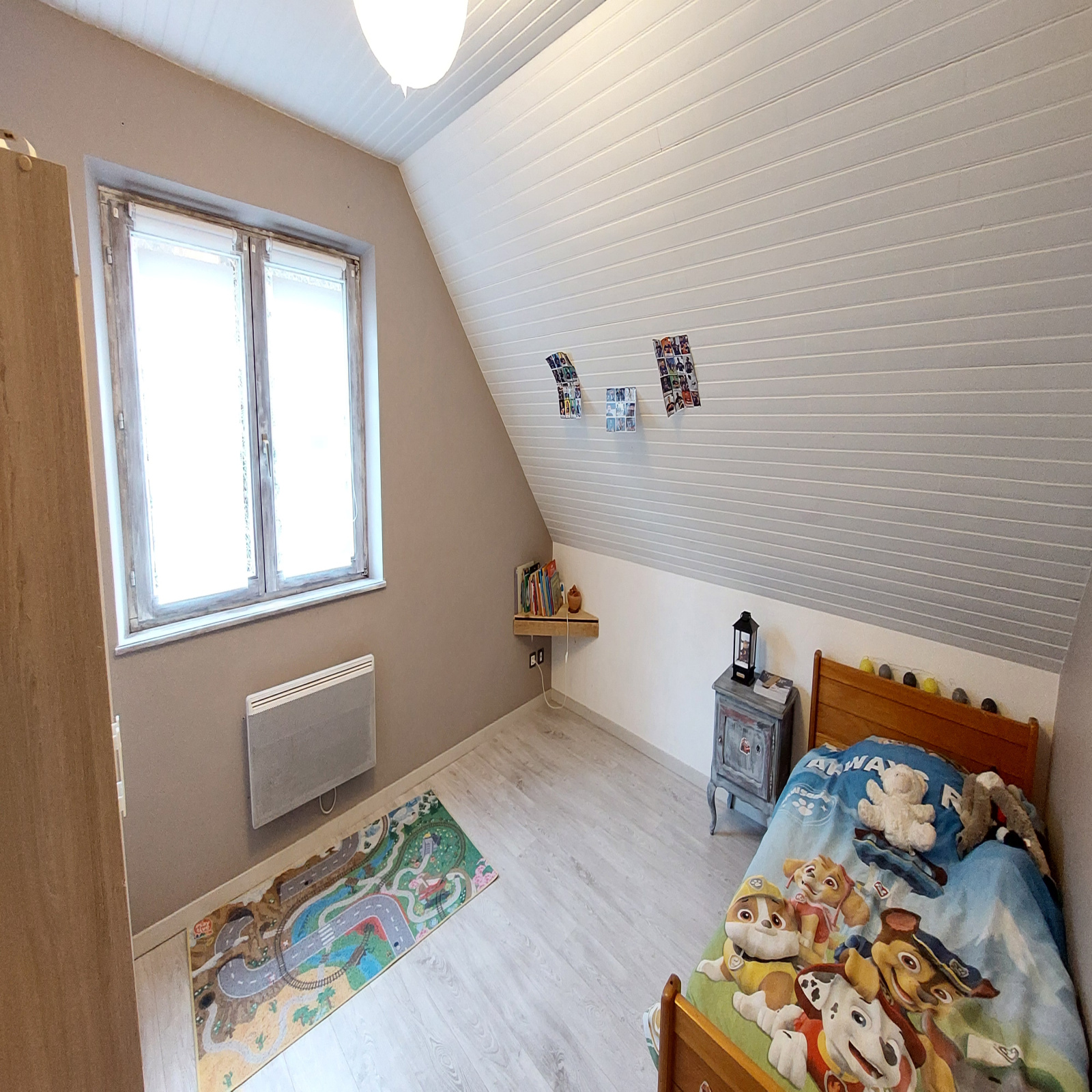 À l’étage, le palier mène à trois chambres dont une avec placards, une salle de bains avec wc et une pièce dédiée au dressing, offrant un confort très appréciable au quotidien.