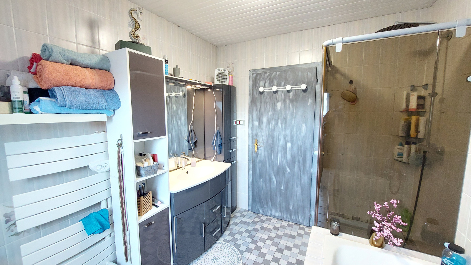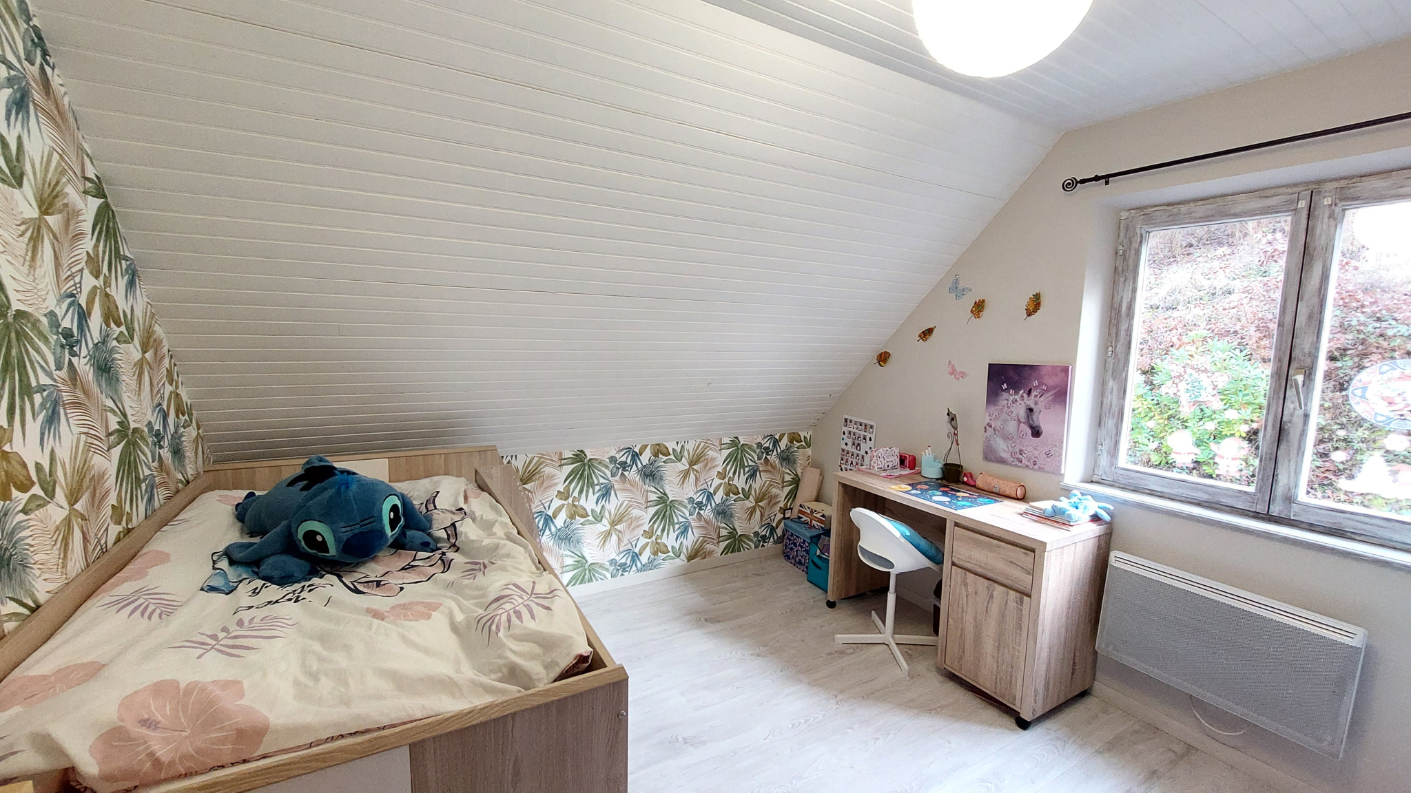 Dès l’entrée, la fonctionnalité des espaces se font ressentir. Le rez-de-chaussée offre une cuisine équipée donnant directement sur une terrasse ainsi qu’une terrasse couverte, parfaites pour profiter des beaux jours. Le salon/séjour, spacieux et accueillant, s’ouvre lui aussi sur l’extérieur, créant une agréable continuité entre intérieur et jardin. Un bureau avec rangements intégrés et un WC complètent ce niveau.